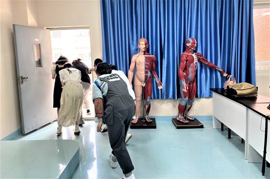 培训会上,倪婷通过五个方面进行讲解。当学生突发晕厥或急性病症时,授课老师应先确认学生情况,与安全员进行联系,根据相关情况做出紧急急救措施,等待安全员的到来护送学生到达医务室;在这过程中,授课老师不得随意离开教室,及时安抚其他同学情绪,保持课堂纪律。倪婷老师根据疫情相关的流调问题提出了解决措施。当授课老师接到流调通知后,先确认学生身份,不论是否阳性,都将学生转移至安全的区域。第三点,当课上遇到发热同学,作为授课老师,应按照疫情防控要求对学生进行分类站立,戴好口罩保护好自身安全;测量学生体温,安抚情绪并配合安全员做好接下来的相关工作。接下来,倪婷为各位老师讲解火灾到来时的处理措施,如遇火灾应先保护自己,拨打消防热线,通过安全通道快速的疏散学生至空旷安全的区域,并进行人数的清点,同时也要做好平时安全检查工作。最后从地震灾害的发生指导各位老师相关的急救知识。