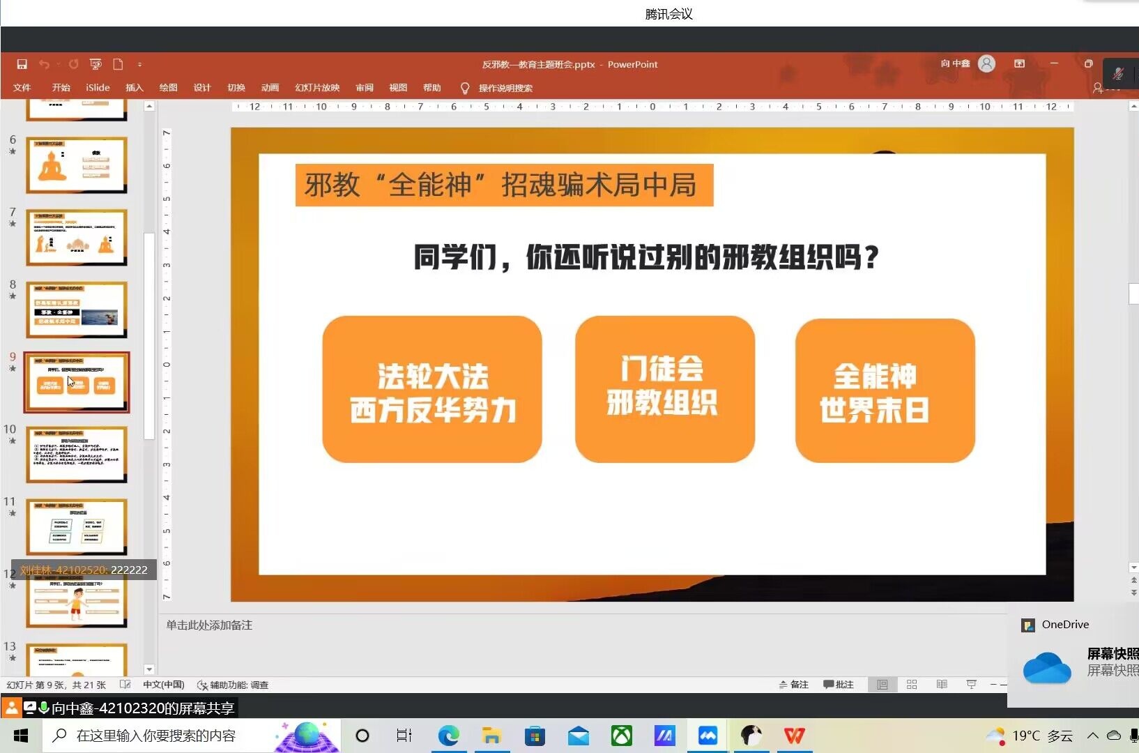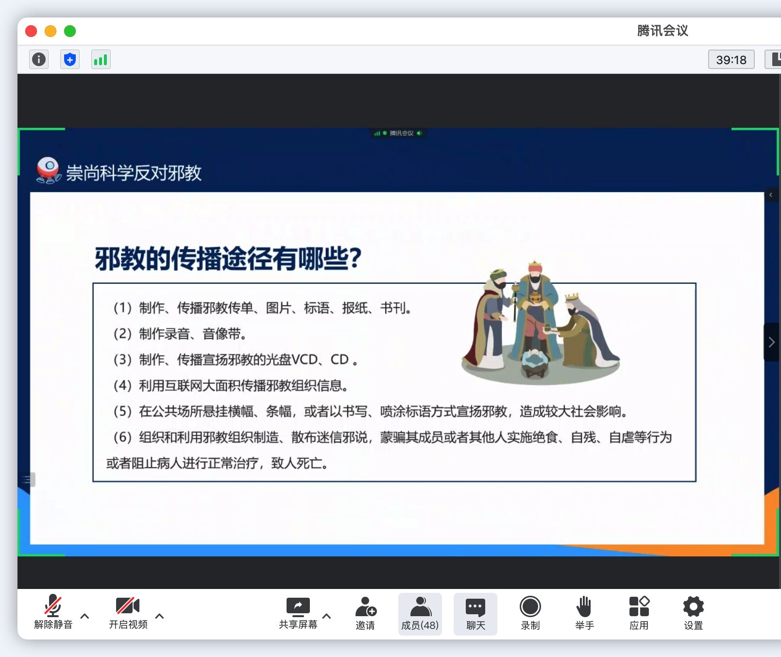 此次活动以班级为单位开展,活动由两个部分组成。第一,各班围绕“崇尚科学,反对邪教”的活动主题,制作PPT进行宣讲,从邪教的本质、邪教的发展、邪教的存在形式等方面讲解邪教的危害,让同学们对邪教有了进一步的认识。第二,各班还组织同学们观看了由四川省委政法委、省教育厅、科协、反邪教协会共同举办的“2022年四川省防范邪教宣传月活动展播”,让每位同学都积极融入到“坚决抵制邪教,关爱家庭,珍惜生命”的活动中,充分做到不听邪教、不信邪教、不传邪教。