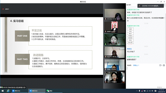 ?为检验2018级社会工作专业学生的毕业实习效果,提升专业实践教学质量,学院于2022年4月18日下午召开毕业实习汇报会。结合当前疫情防控形势,本次汇报采取线上方式,分两组同时进行,由小组组长主持,老服社工教研室教师、2018级社会工作全体学生参与。 ? ? ? 第1小组实习汇报会议开始前由主持人宣读纪律,汇报流程以及注意事项,全体学生确认无误...