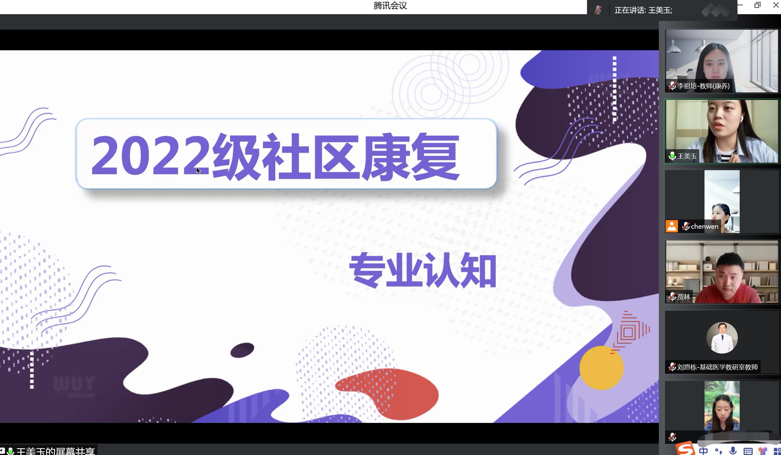 2022年9月6日上午10点50,基础医学教研室在线上举办了2022级社区康复专业新生专业认知讲座。本次新生专业认知讲座由社区康复专业负责人王美玉主讲,邀请437必赢会员中心直属党支部副书记、社区康复专业辅导员陈雯出席,社区康复专业授课教师以及全体2022级社区康复新生参加。 2022级社区康复专业新生专业认知教育会现场王美玉以“大学是什么?”引出学生对...