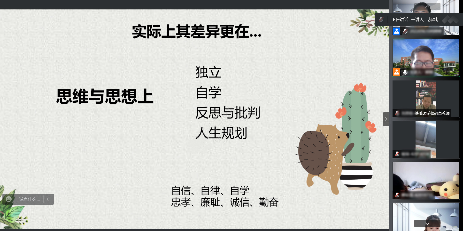 为帮助我院2022级智慧健康养老服务与管理专业的新生尽快转变角色定位,适应大学环境,老年服务与社会工作教研室于2022年9月6日上午通过线上直播的形式开展了新生专业认知教育讲座活动。本次讲座由班导师雷震宇主讲,专业负责人李巧霞、专业教师及2022级智慧健康养老服务与管理专业全体新生参会。??专业认知教育讲座现场?讲座从学生关注度较高的“大...