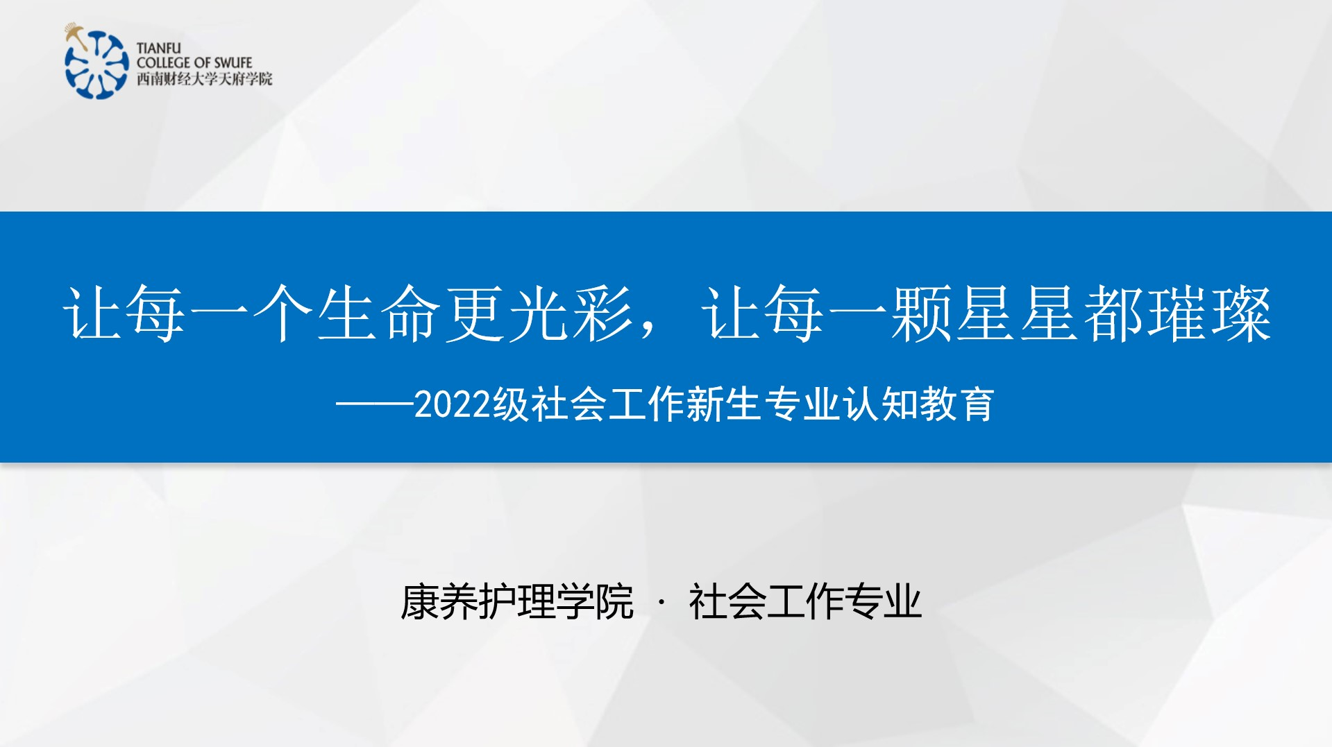 为帮助社会工作专业新生了解专业,明确学习要求,更好地做好大学生活规划,9月6日上午10点,老年服务与社会工作教研室通过线上直播的形式举办了新生专业认知教育讲座。本次讲座由社会工作专业负责人王志主持,专业教师杨凤主讲,专业授课老师及全体2022级社会工作新生参加。 ?2022级社会工作新生专业认知教育 本次讲座重点从大学学习生活、专业背景与...